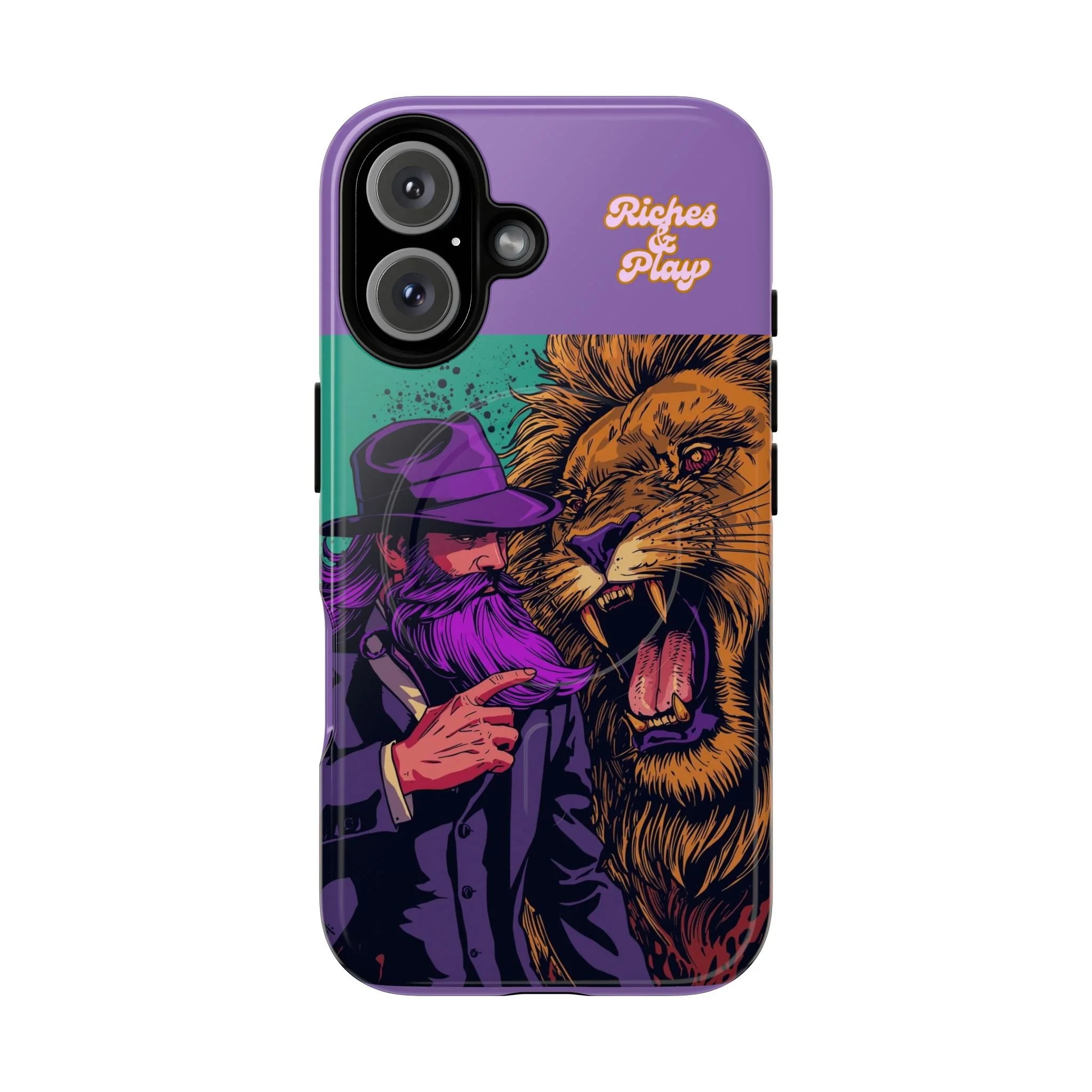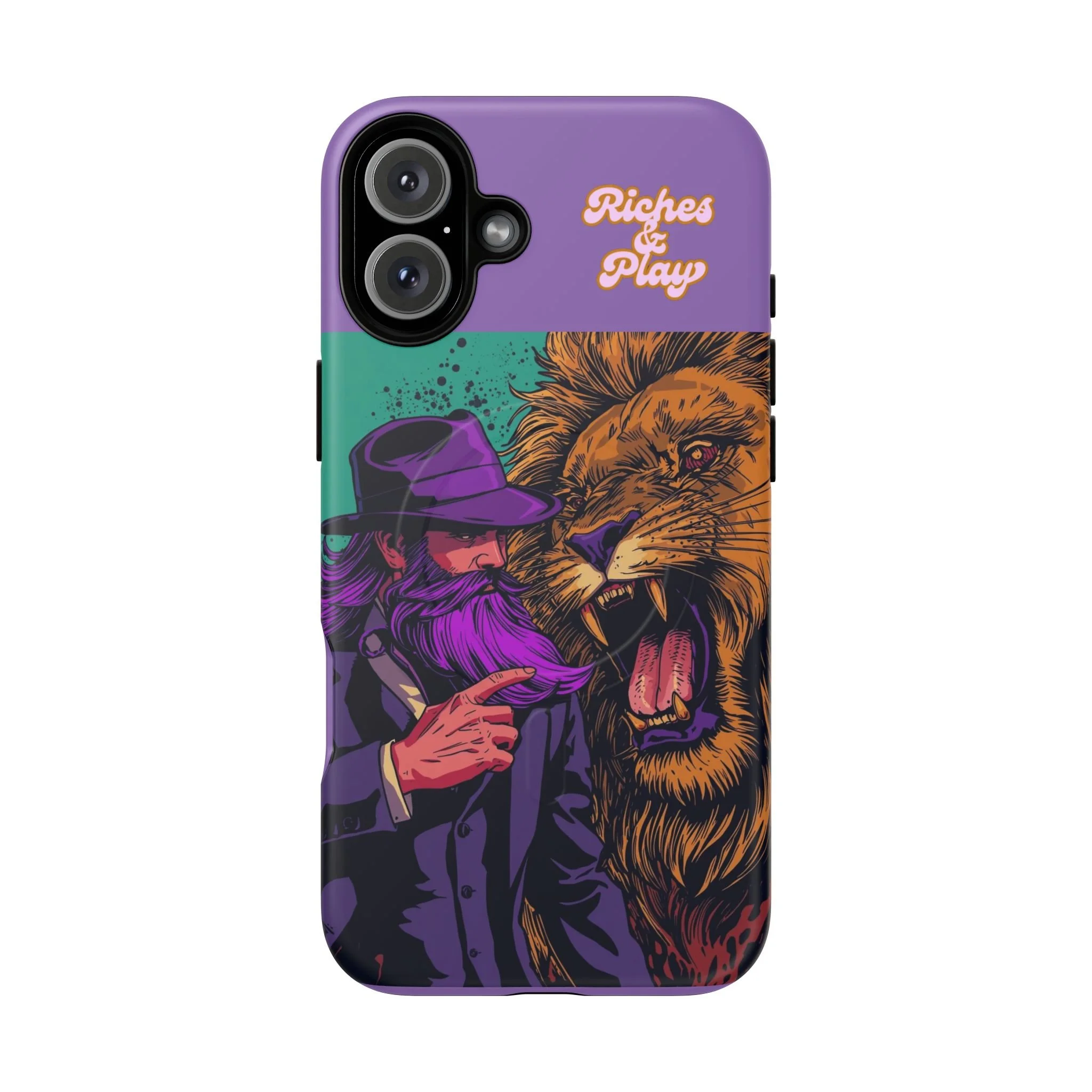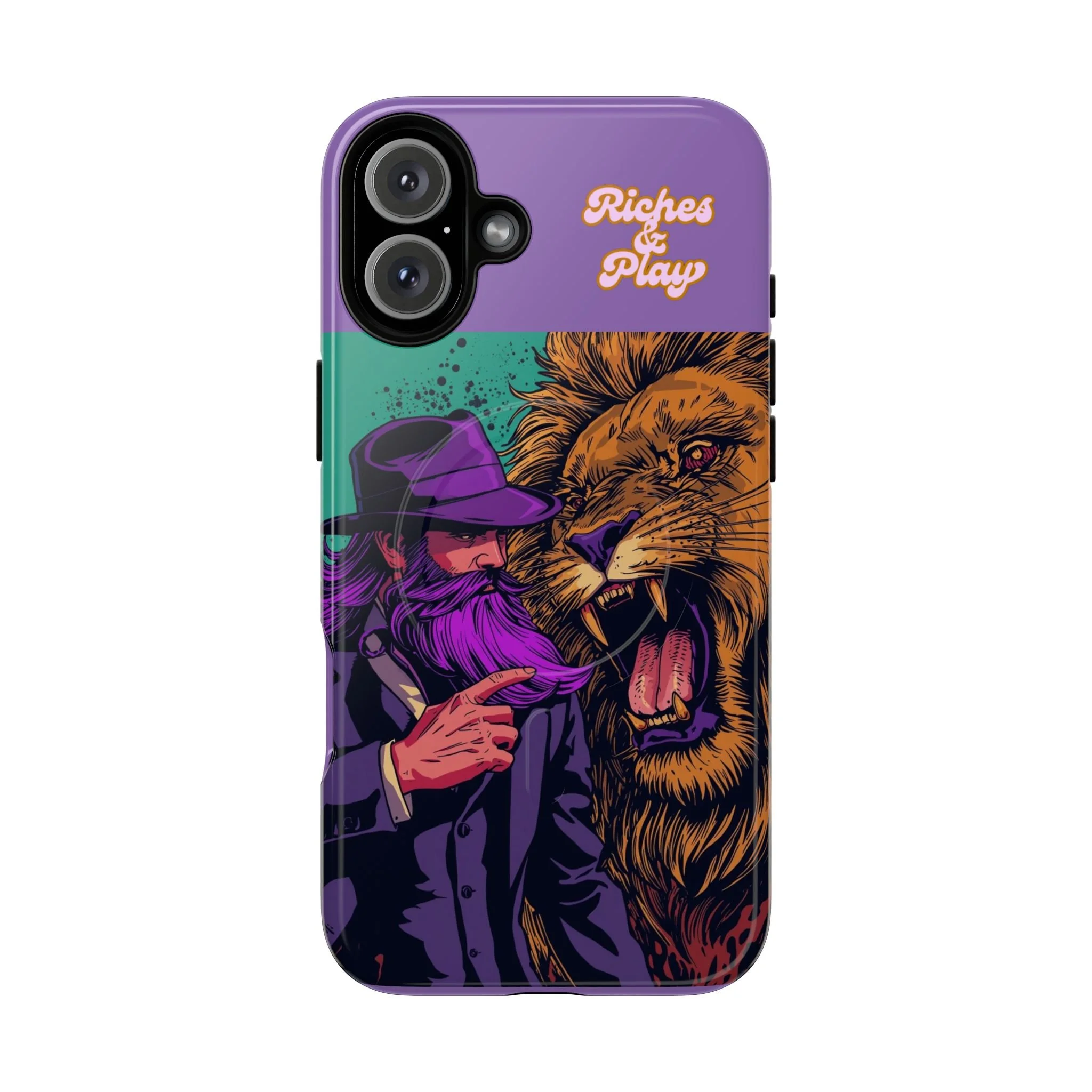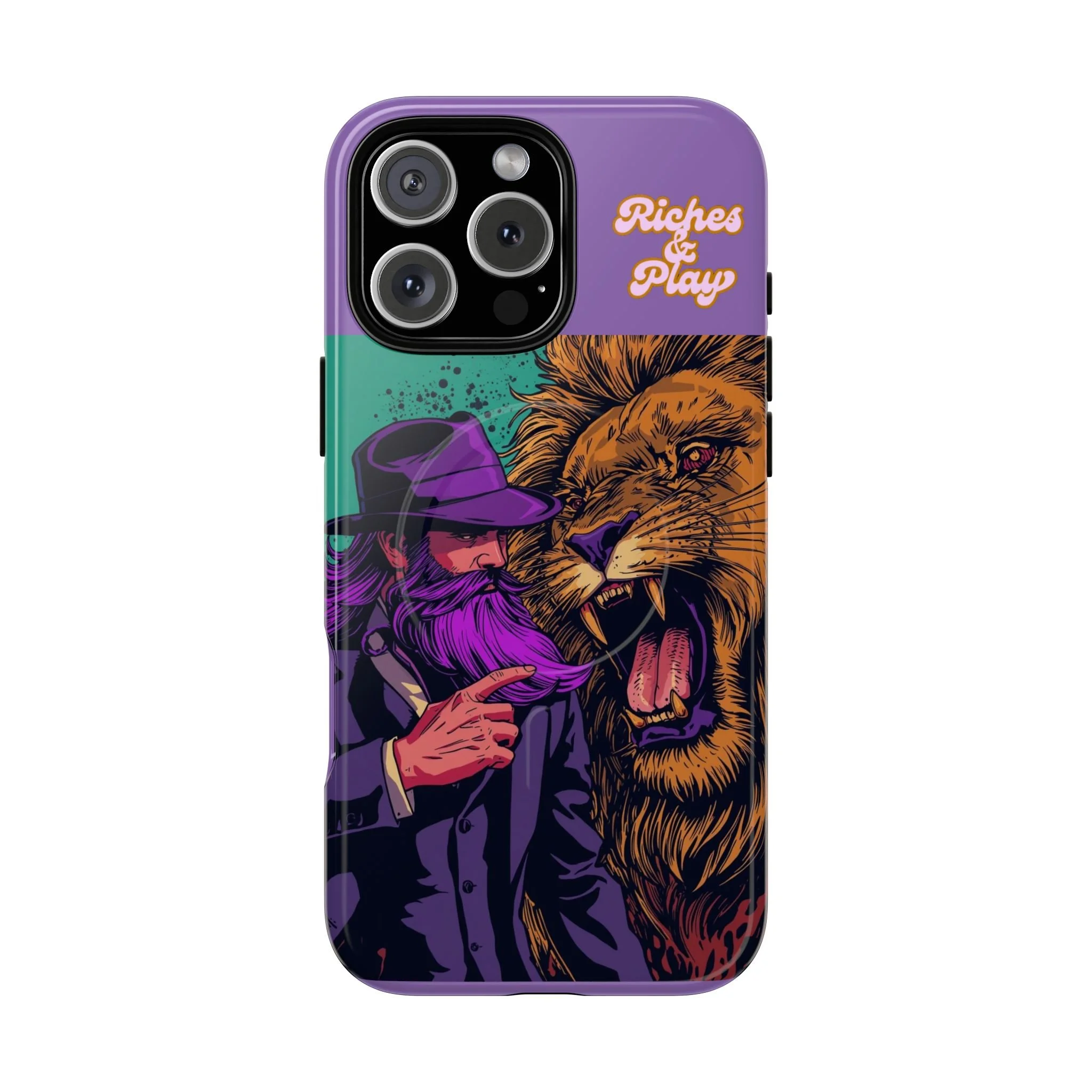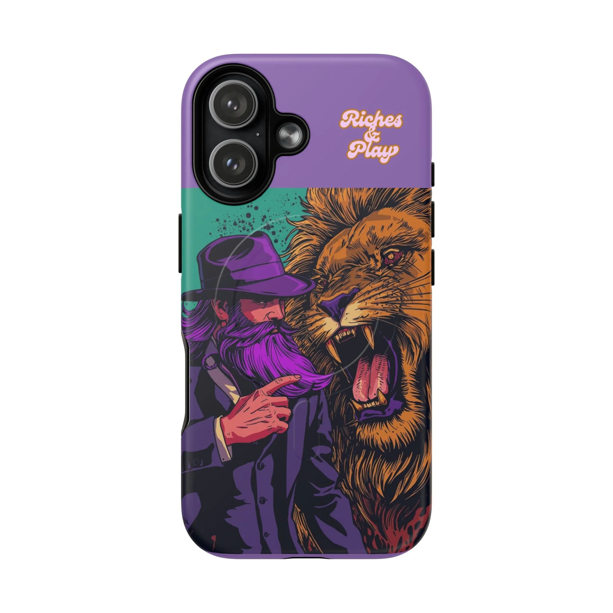 This tough magnetic phone case combines bold, illustrated style with military-grade protection. A dual-layer shell with a shock-absorbing TPU liner wraps around a high-density polycarbonate exterior to keep your phone safe from drops and daily wear. The vivid 3D wrap print shows a fierce lion and a bearded, hat-wearing character in rich purples and golds — a design that feels confident, streetwise, and a little mysterious. MagSafe-compatible magnets sit flush inside the case for secure attachment to magnetic chargers and accessories. Glossy and matte finish options let you choose between a vibrant shine or a more subdued, tactile look. Clear, open ports keep charging and audio simple, while the precision cutouts maintain camera performance.