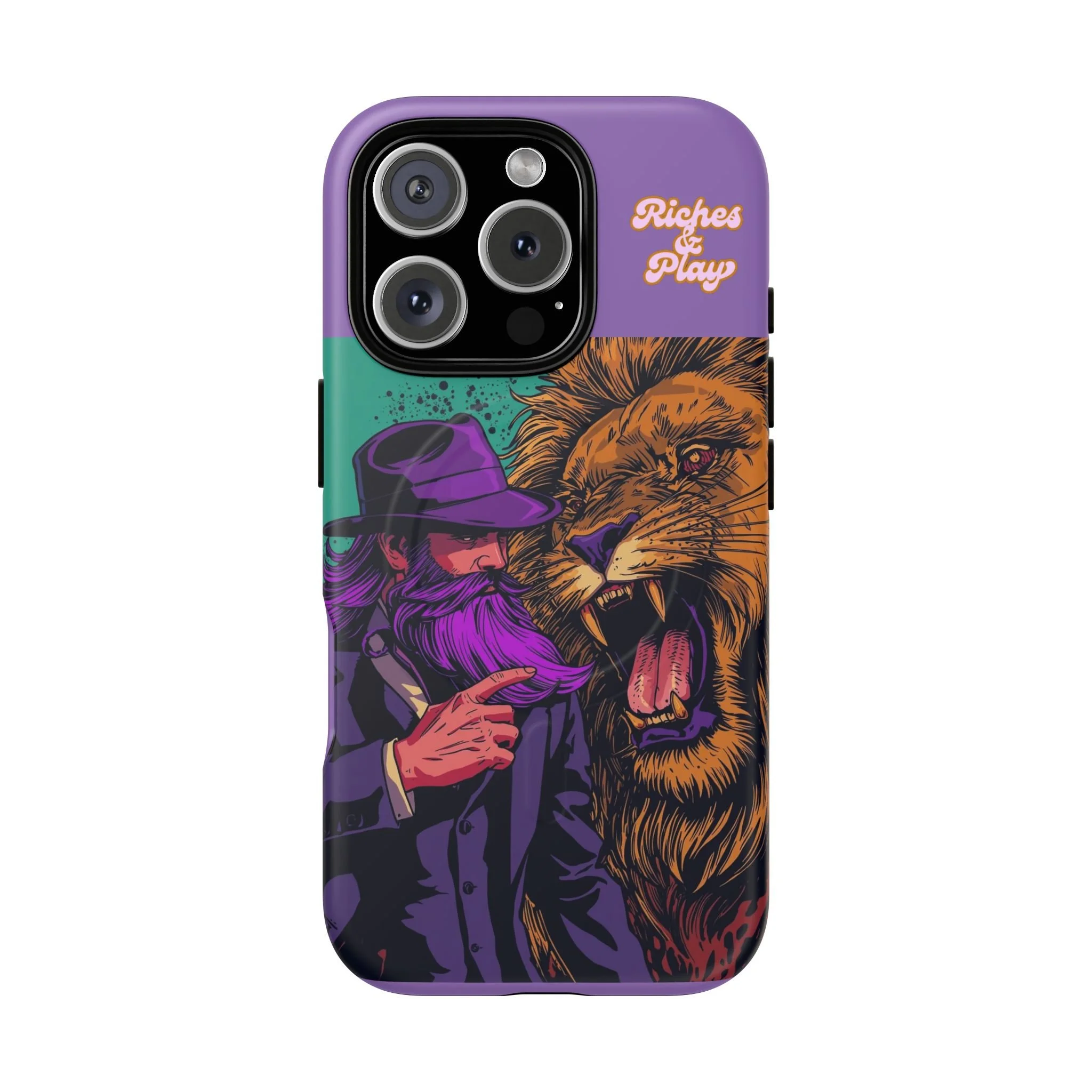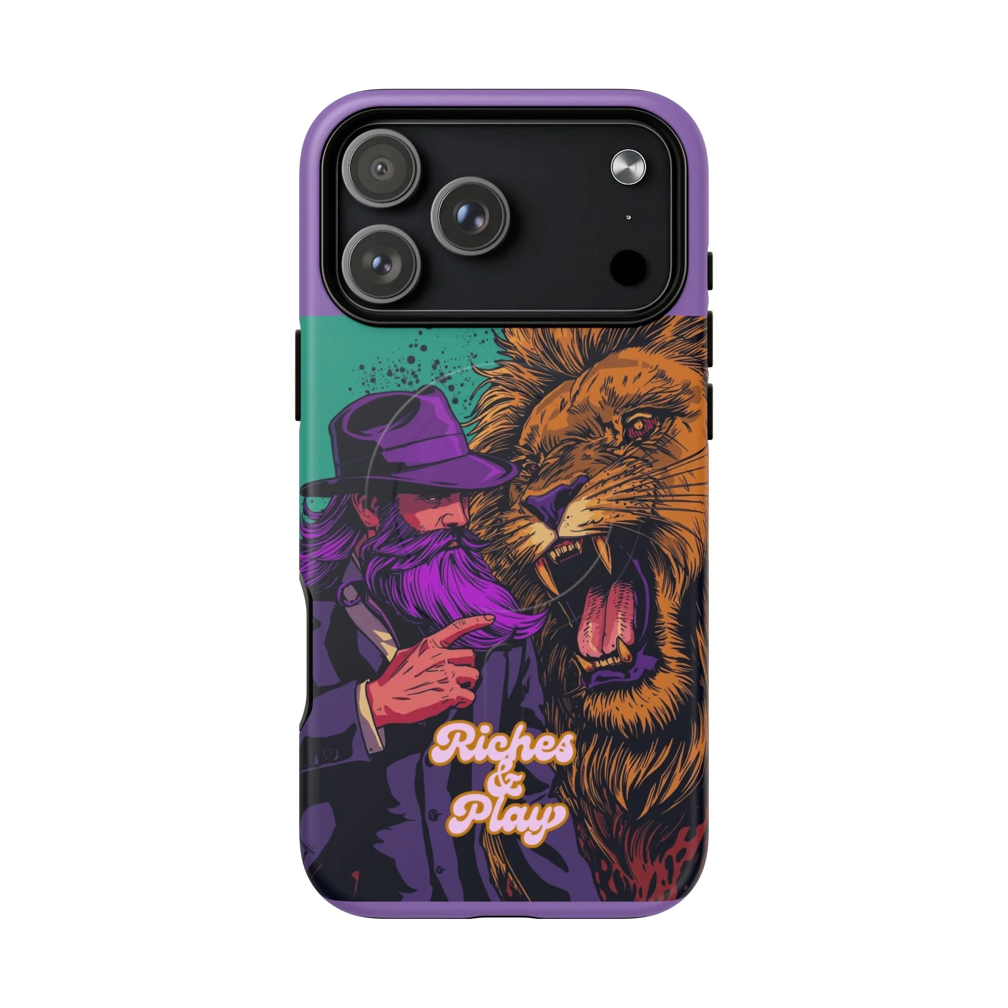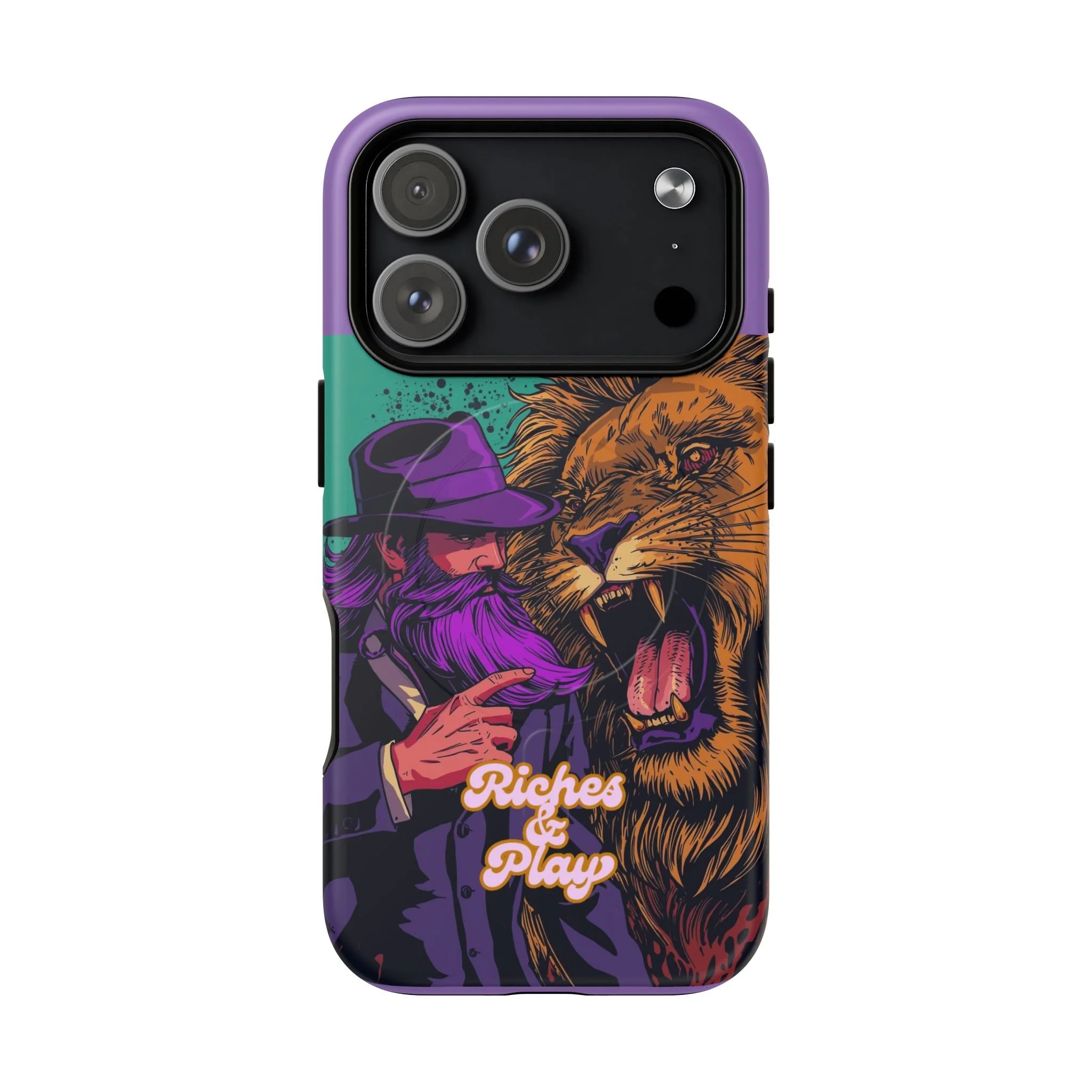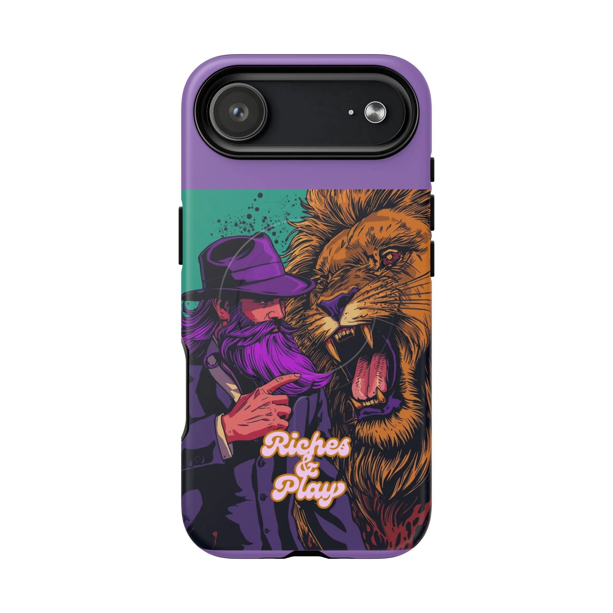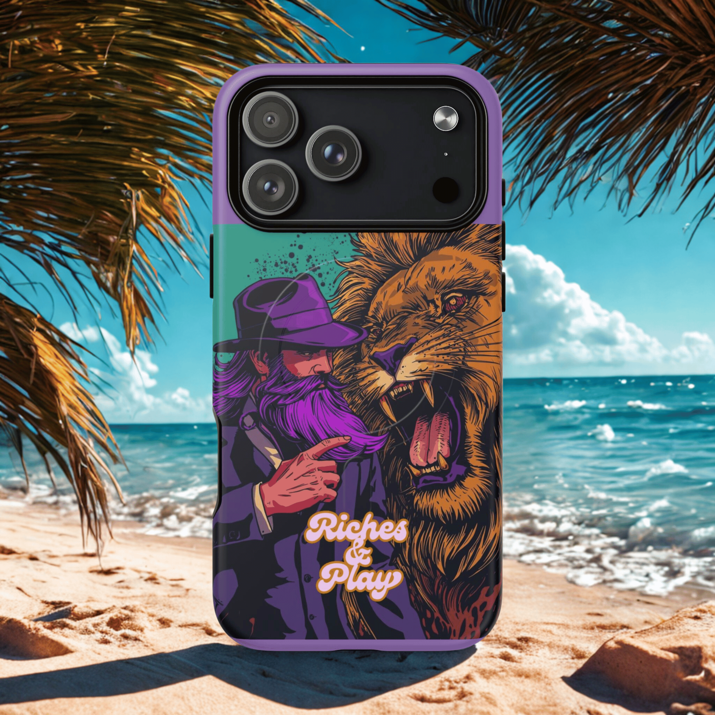 This tough magnetic phone case combines bold, illustrated style with military-grade protection. A dual-layer shell with a shock-absorbing TPU liner wraps around a high-density polycarbonate exterior to keep your phone safe from drops and daily wear. The vivid 3D wrap print shows a fierce lion and a bearded, hat-wearing character in rich purples and golds — a design that feels confident, streetwise, and a little mysterious. MagSafe-compatible magnets sit flush inside the case for secure attachment to magnetic chargers and accessories. Glossy and matte finish options let you choose between a vibrant shine or a more subdued, tactile look. Clear, open ports keep charging and audio simple, while the precision cutouts maintain camera performance.