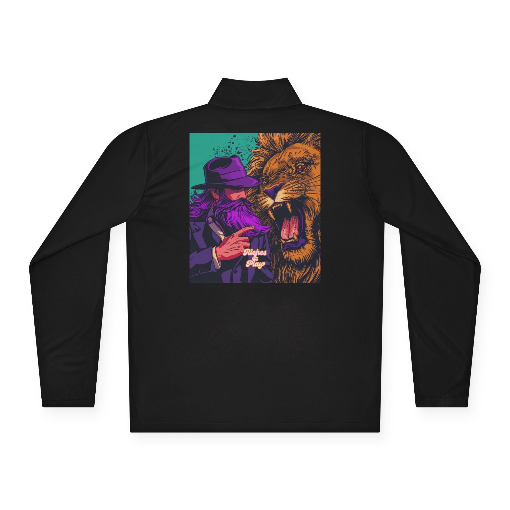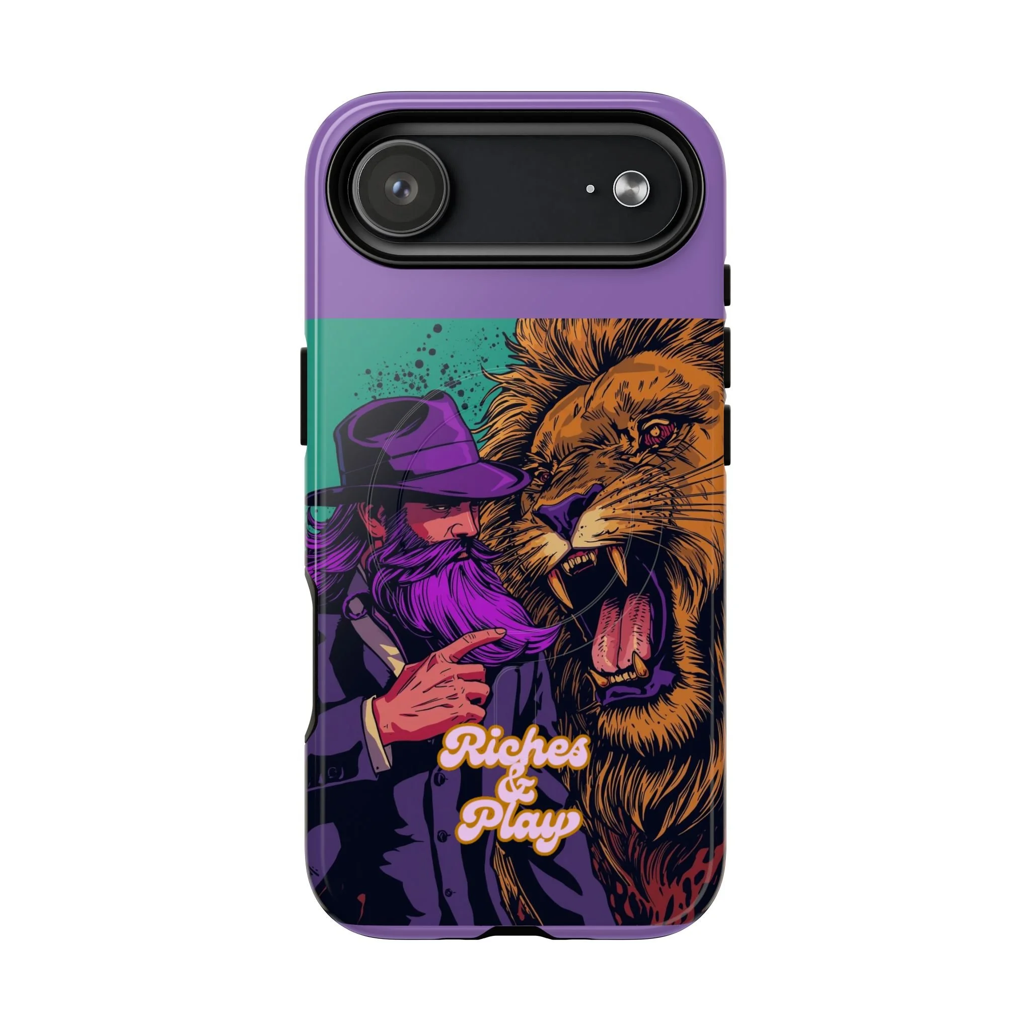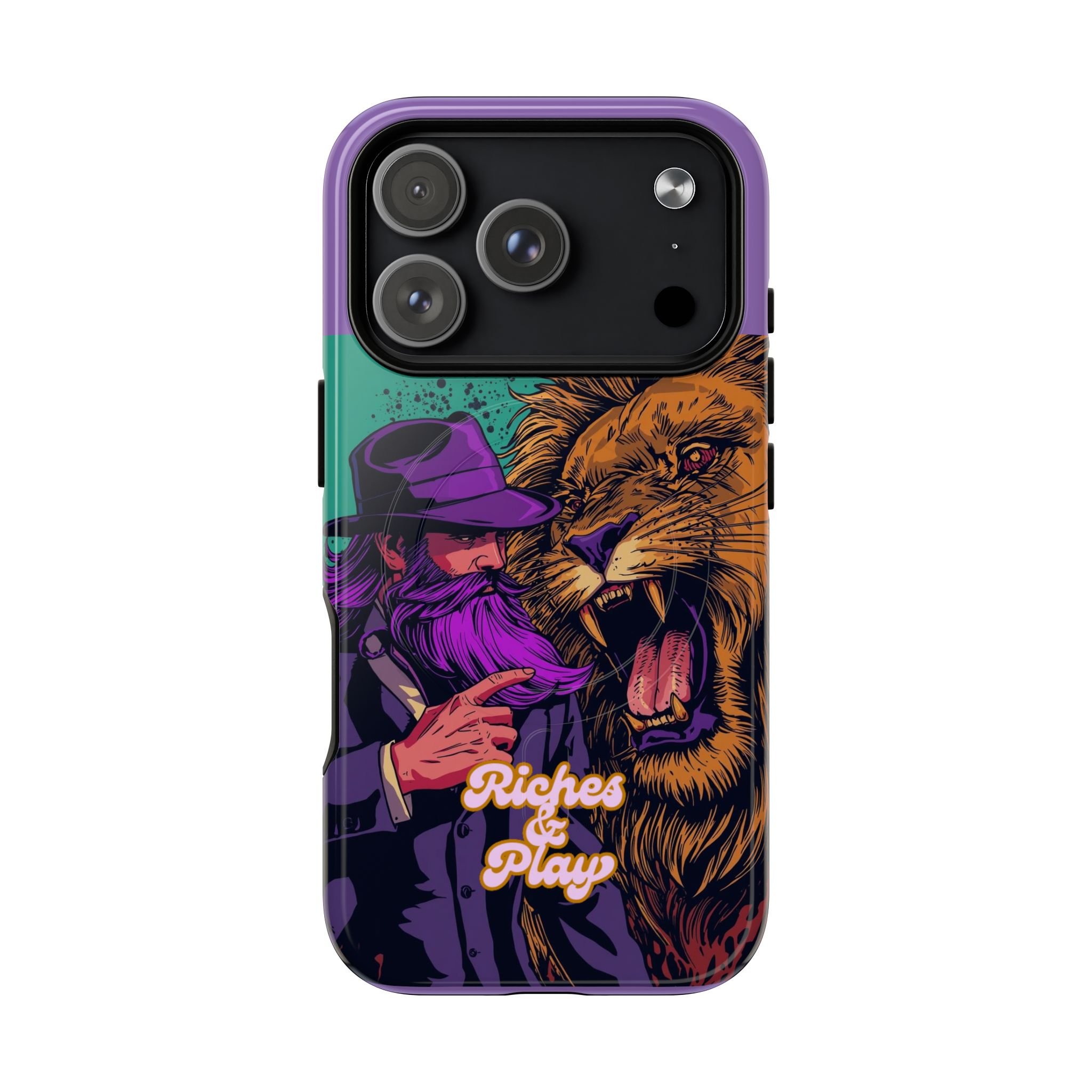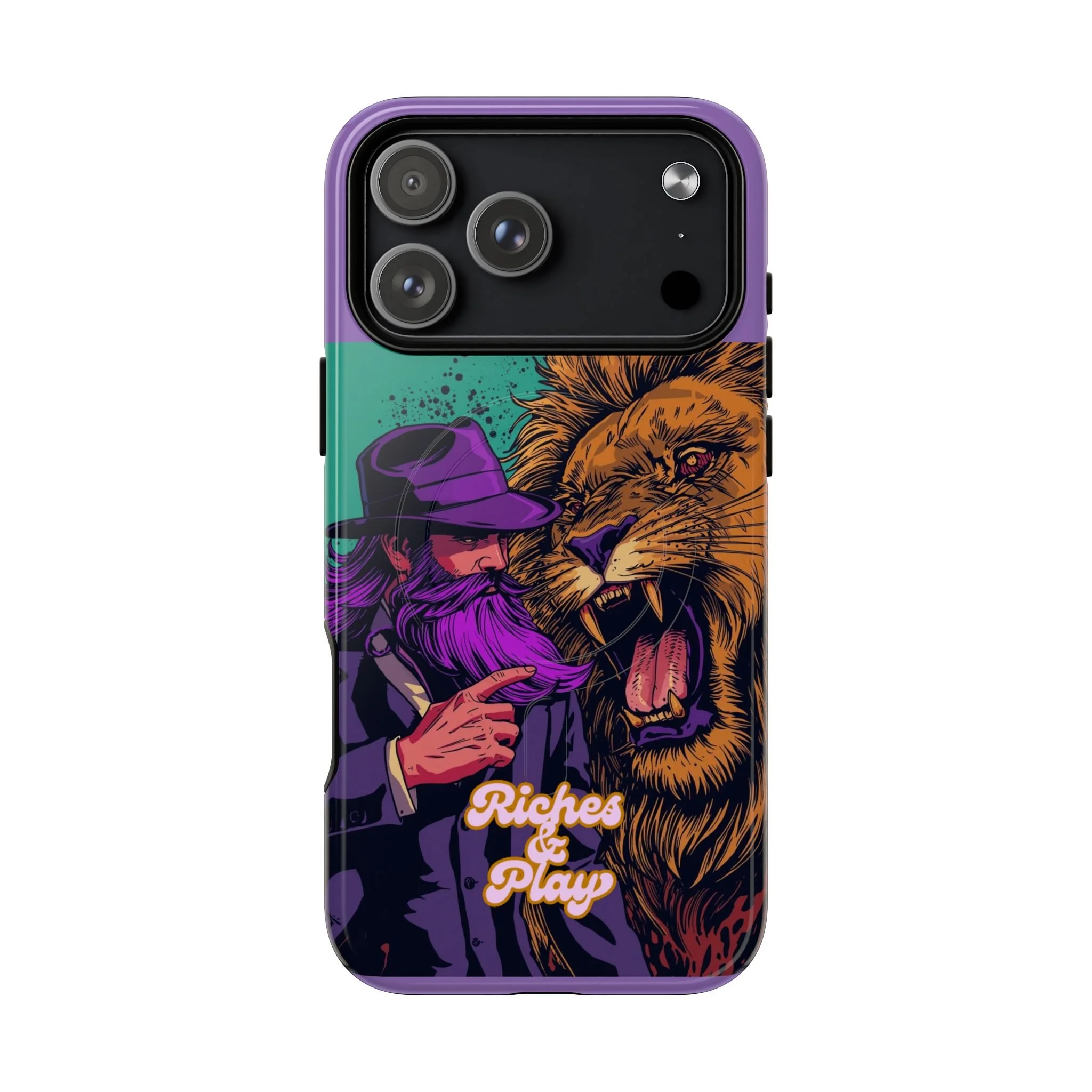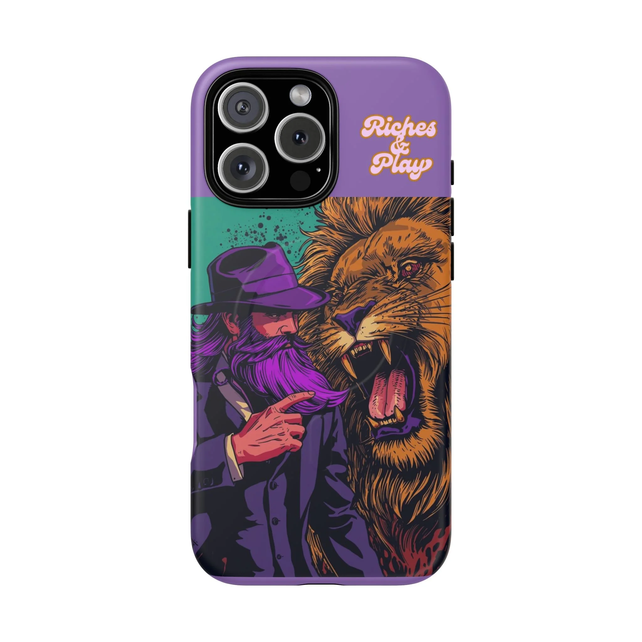 This tough magnetic phone case combines bold, illustrated style with military-grade protection. A dual-layer shell with a shock-absorbing TPU liner wraps around a high-density polycarbonate exterior to keep your phone safe from drops and daily wear. The vivid 3D wrap print shows a fierce lion and a bearded, hat-wearing character in rich purples and golds — a design that feels confident, streetwise, and a little mysterious. MagSafe-compatible magnets sit flush inside the case for secure attachment to magnetic chargers and accessories. Glossy and matte finish options let you choose between a vibrant shine or a more subdued, tactile look. Clear, open ports keep charging and audio simple, while the precision cutouts maintain camera performance.