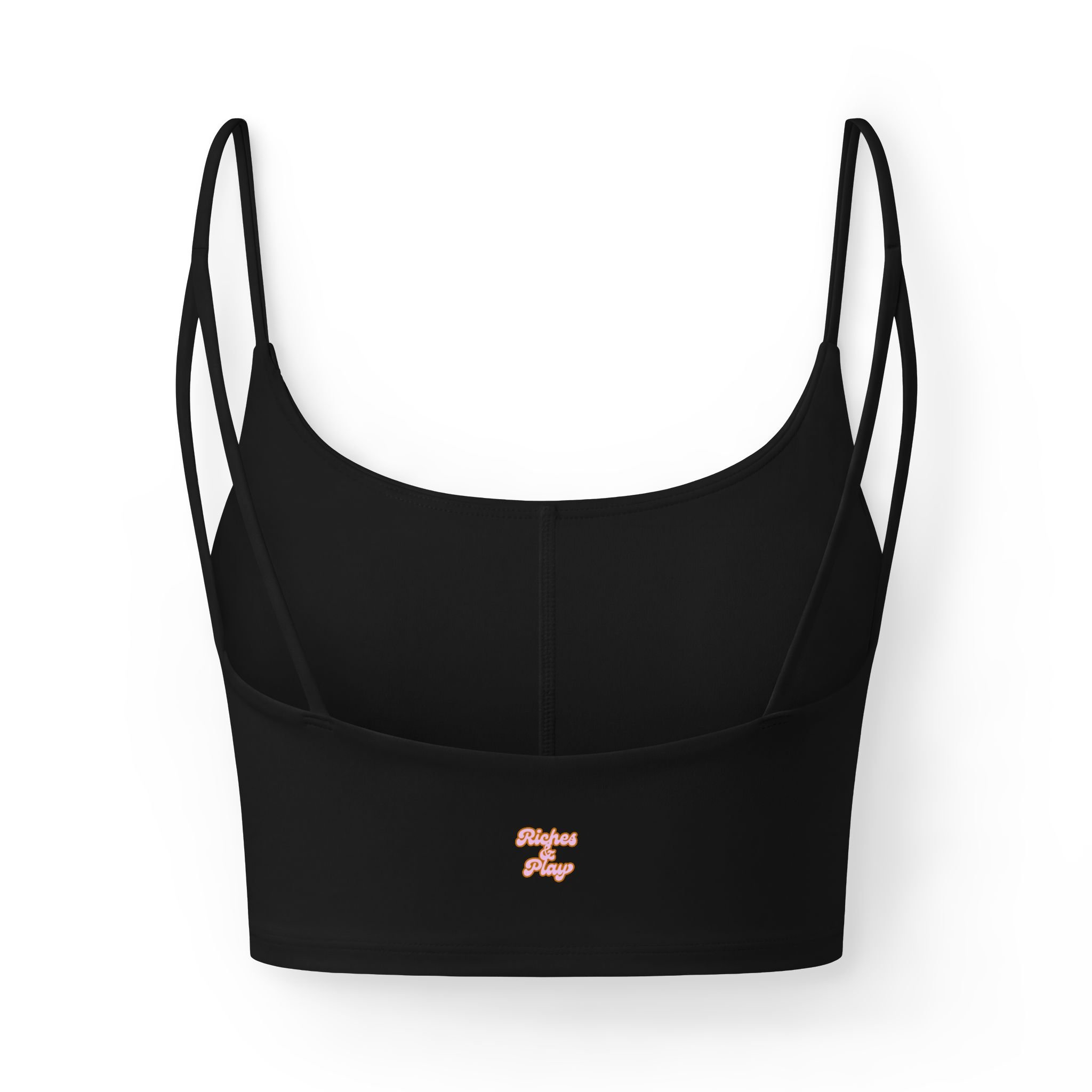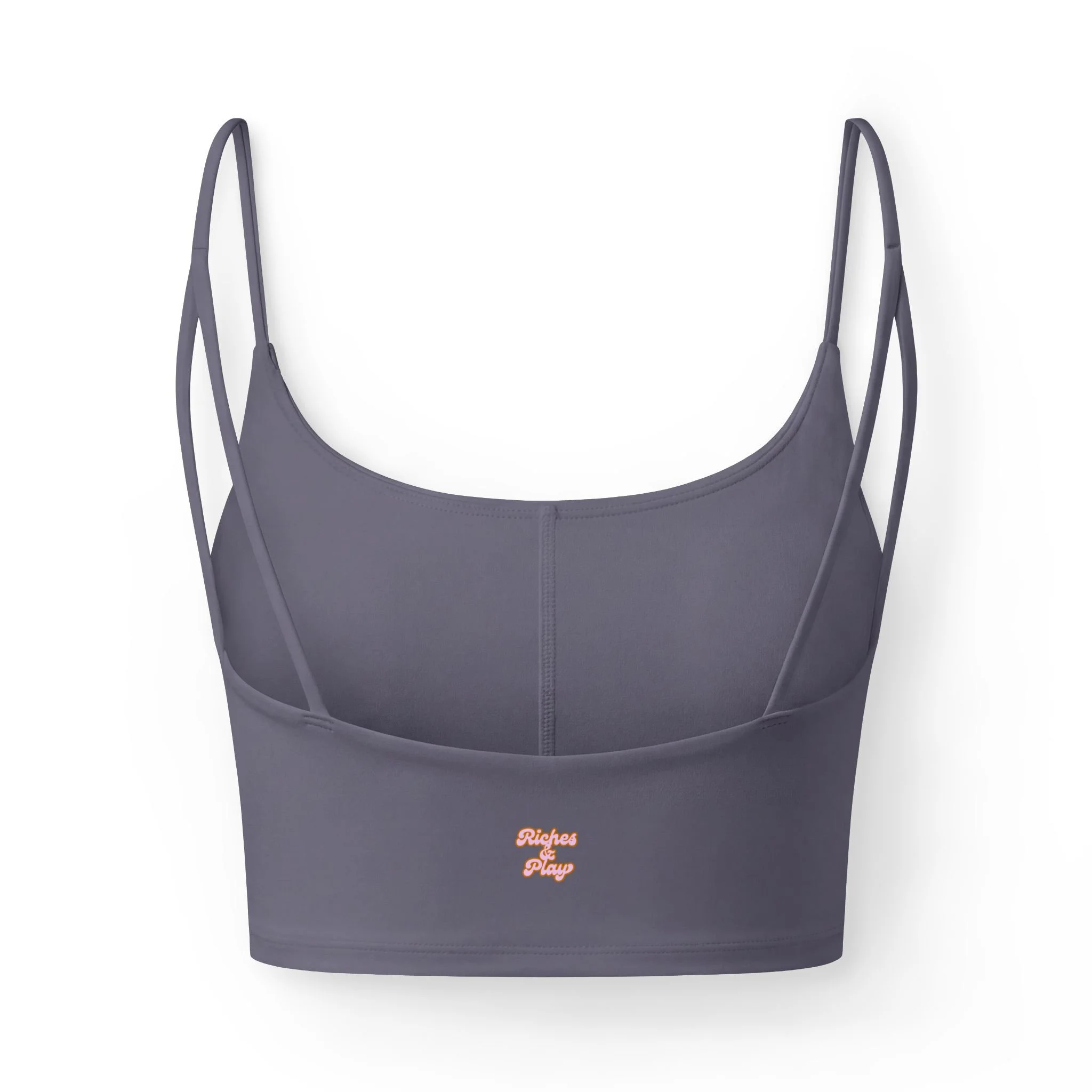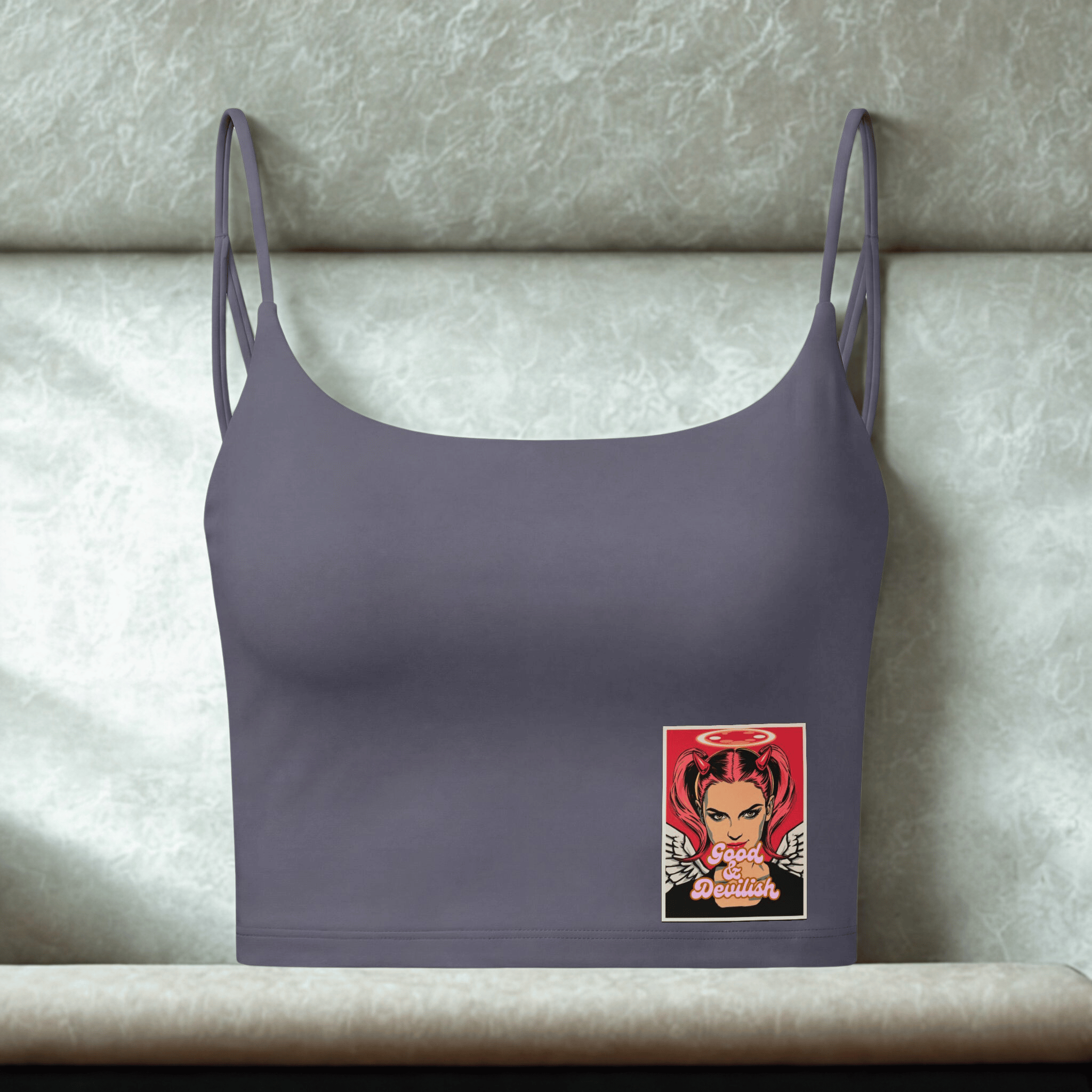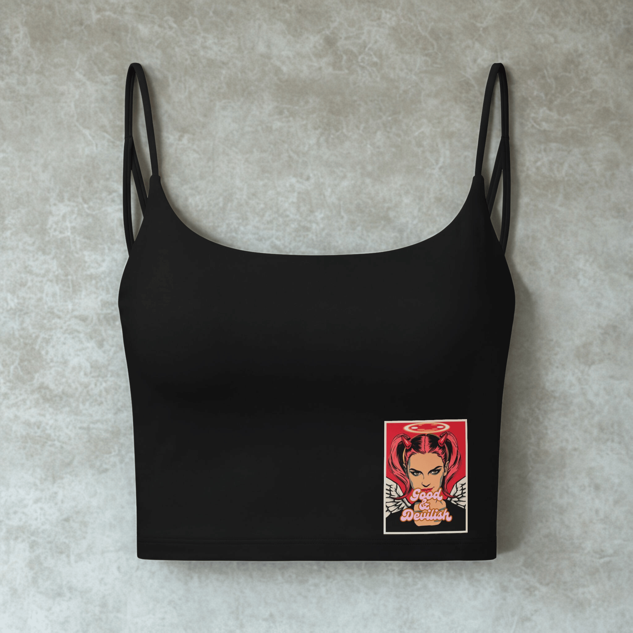 This luxe sports bra is built for movement and attitude. It sits close to the skin with a second-skin fit that moves when you move—stretching, bending, and holding through every pose and rep. The fabric feels silk-soft but performs like high-end activewear: breathable, resilient, and slightly compressive where you need it. A hidden inner bra with removable pads lets you dial support up or down. Wear it for heated flow, circuit days, or when you want to feel a little devilish on the run. The subtly sexy cut and clean lines layer easily under a tank or stand alone with the matching leggings, making it an elevated staple in any workout wardrobe.