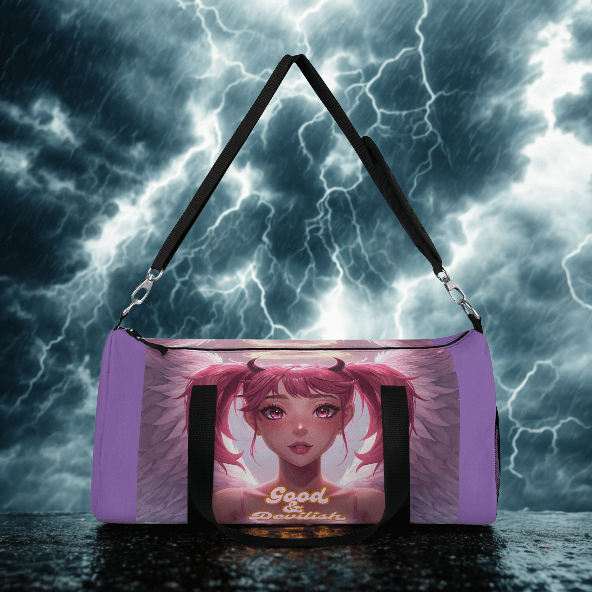 This duffel bag carries attitude. Midnight-black and built from tough polyester Oxford canvas, it slips into weekend plans and late-night escapes with equal swagger. The “good & devilish” vibe shows up in every seam—a compact silhouette that’s both playful and confident. Slip in gym gear, a change of clothes, a favorite jacket, and a little mischief. The adjustable shoulder strap and brushed-nickel hardware make it easy to sling on and go. Inside, a zip pocket with a sewn name tag keeps things personal; an exterior mesh side pocket holds a water bottle for quick reach. It’s the kind of bag that announces you came prepared and you came to have a little fun. Fits adults, offered in small and large sizes, and assembled in the USA from globally sourced parts.