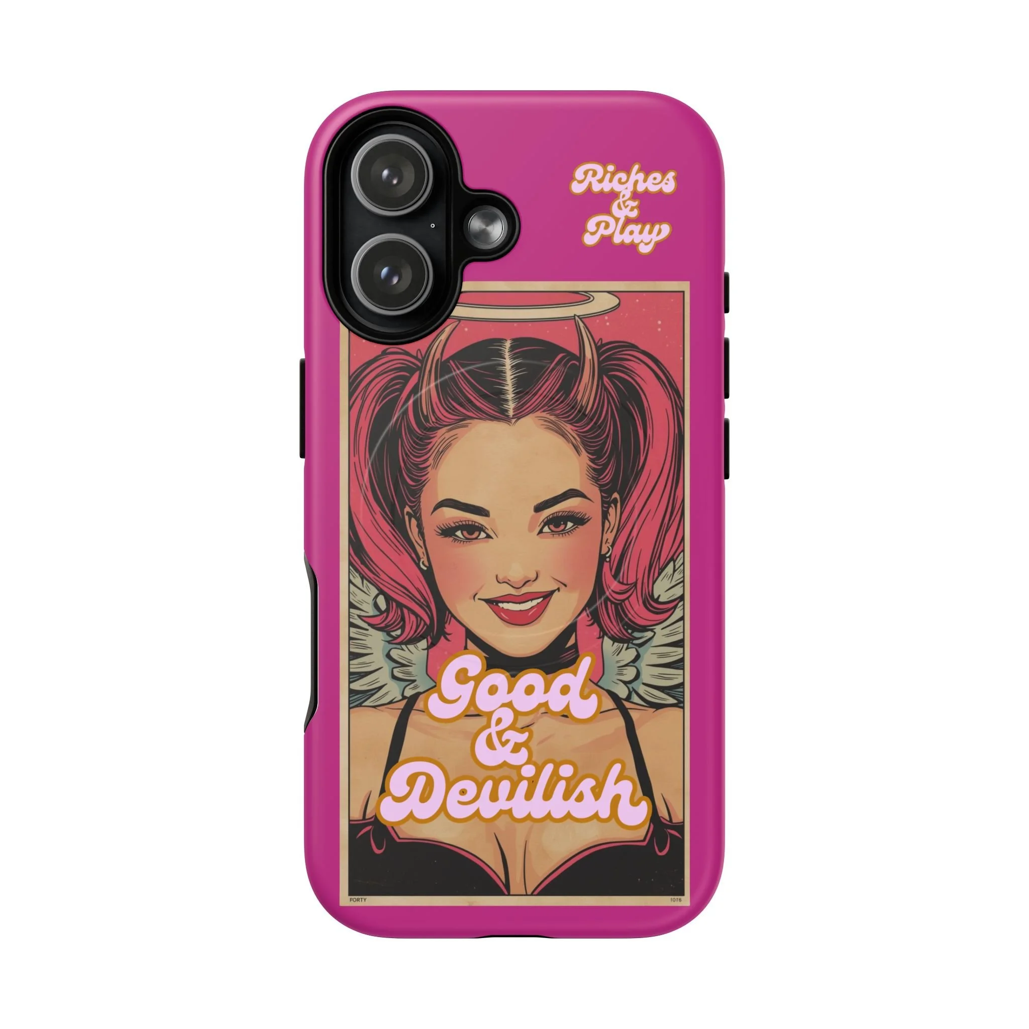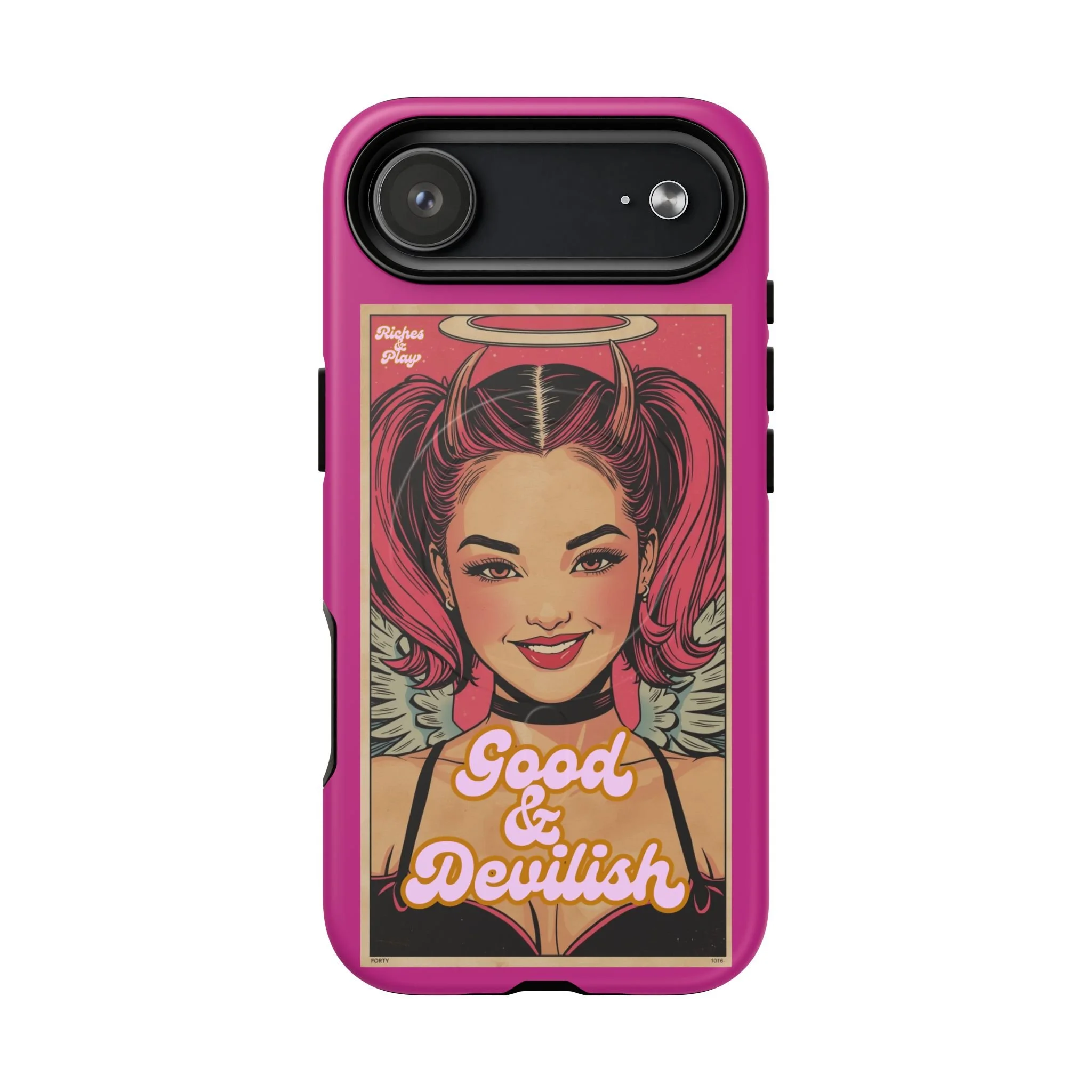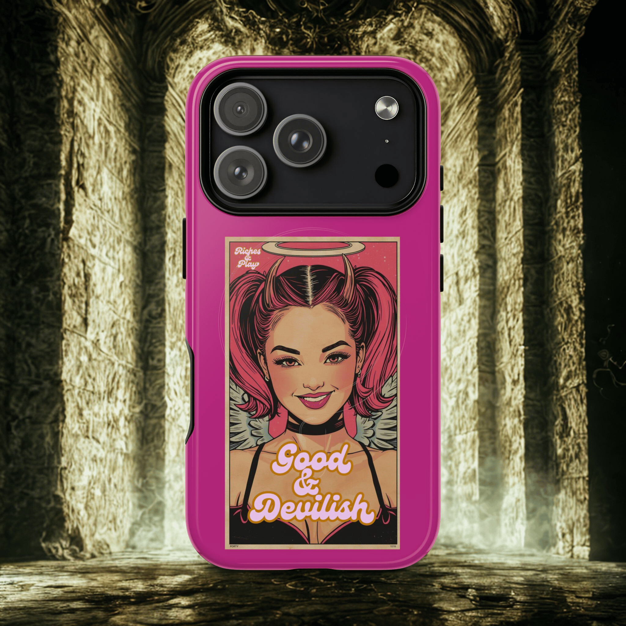This slim, striking magnet-compatible phone case lives in the space between halo and horns. The design threads playful temptation with confident style — glossy or matte finishes catch the light while a soft TPU liner cushions every drop. Slide it on and you get a secure MagSafe connection, a snug dual-layer fit, and a bold image that reads as both mischievous and chic. It’s made from tough polycarbonate with a shock-absorbing silicone interior, so your phone looks provocative and stays protected whether you’re out for a night that leans wicked or keeping things angelic at brunch.