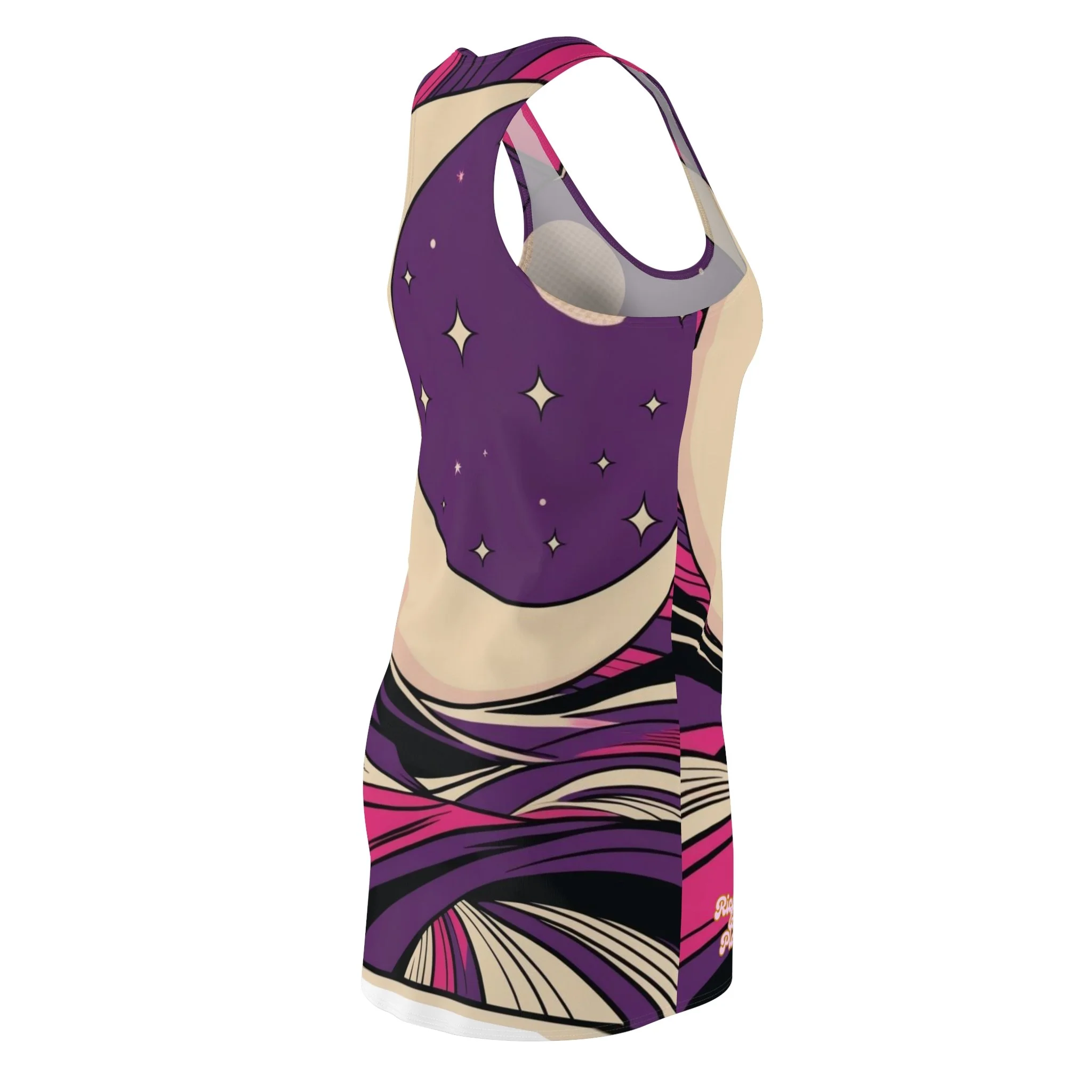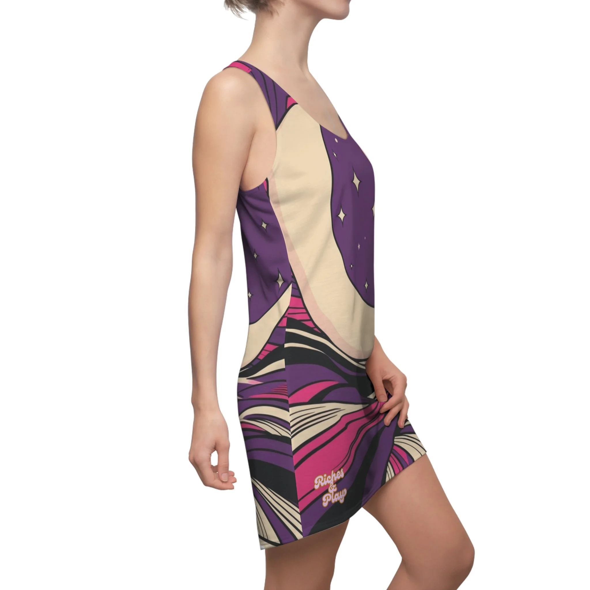 This racerback dress feels like slipping into twilight—soft, cool, and a little daring. The purple moonwave print catches the eye with flowing, lunar-inspired swirls that read equally sensual and artful. Lightweight fabric skims the body in a sporty, figure-flattering cut that moves easily between late-night rooftop plans and relaxed evenings at home. The self-fabric binding and side seams give a clean, tailored edge while keeping the silhouette comfortable and confident. Wear it with bare shoulders and sandals for a night out, or pair with a slouchy cardigan for quiet hours before sleep. It’s for someone who wants a dress that’s both effortlessly wearable and distinctly their own—subtle sexiness wrapped in celestial style.